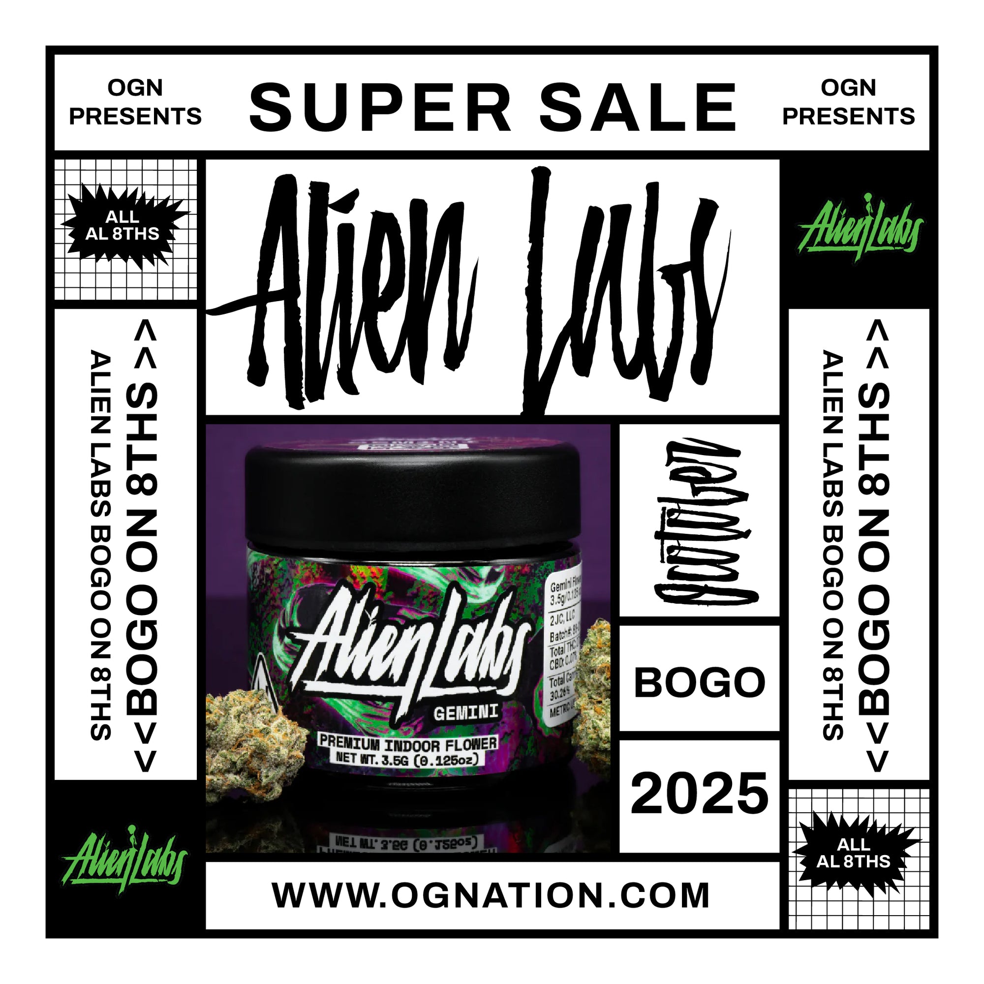 ALIEN LABS BOGO ON 8THS.Discounts valid at all locations, delivery & pickup orders.Online Orders & Weedmaps. May not double stack with happy hour or FTP discount.